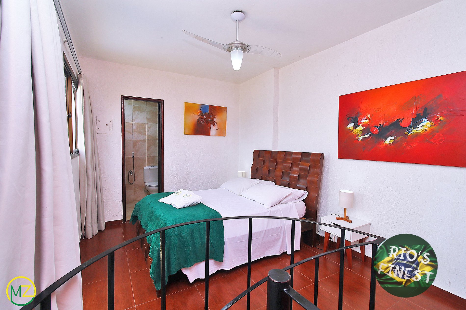 Going up the spiral staircase, you reach the second floor which has a bedroom (without a door) with a double bed, small wardrobe, SmartTV, ceiling fan and split air conditioning. Right in front, there is a terrace with a table and 4 chairs and a swimming pool to relax with a panoramic view of the neighborhood and the sea of Copacabana.