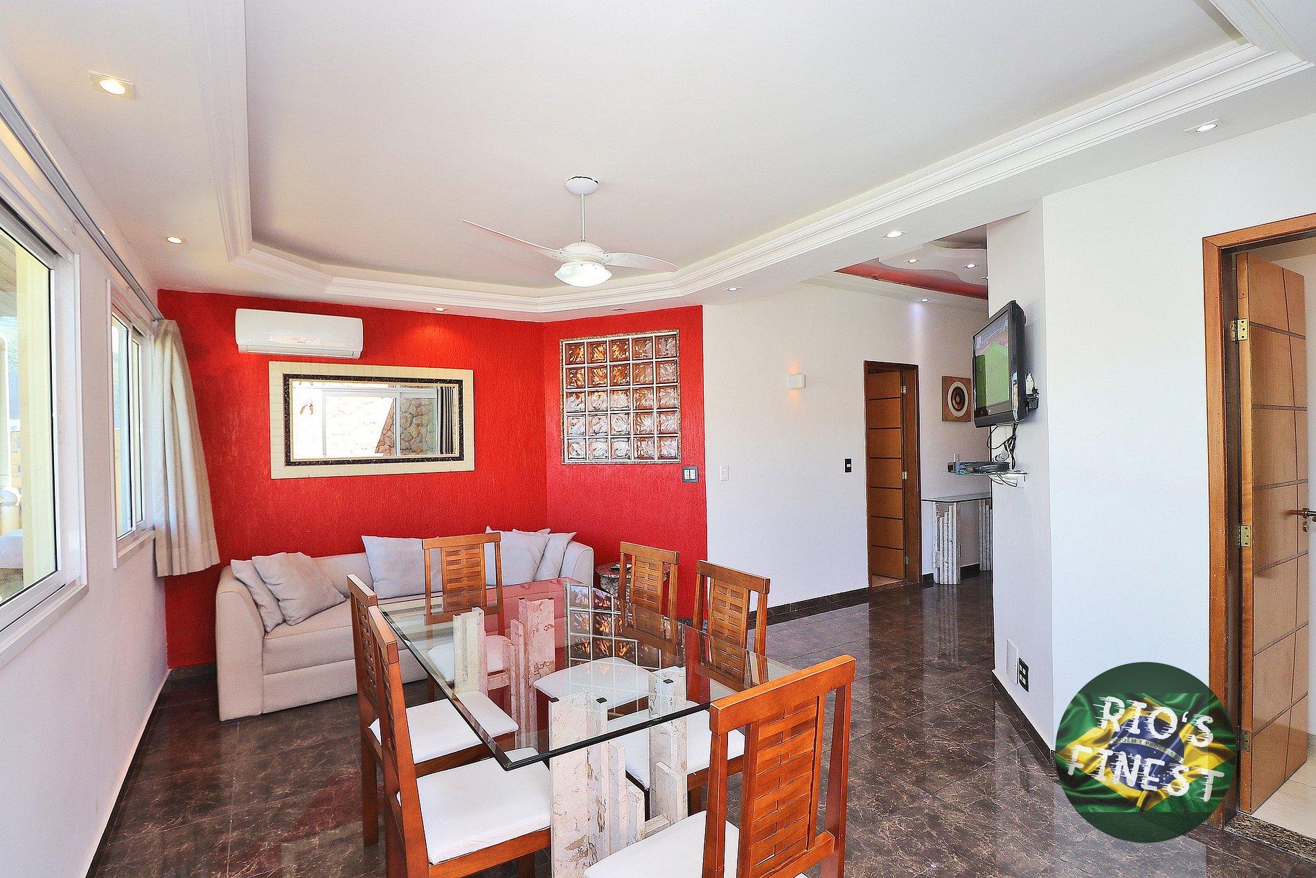 La sala cuenta con un cómodo sofá-cama matrimonial, mesa de comedor con 6 sillas, SmartTV, ventilador de techo y aire acondicionado split.