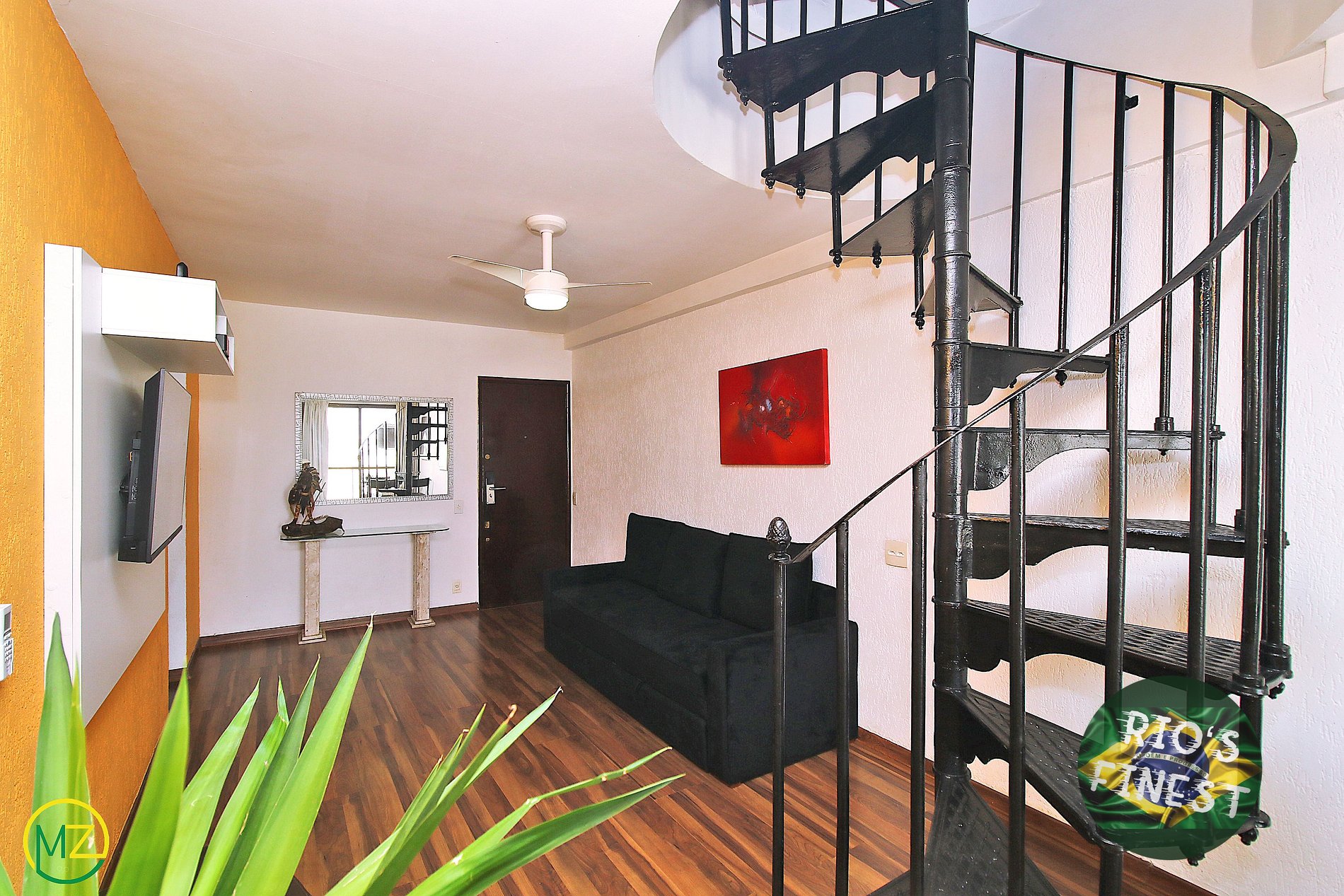 Subiendo la escalera de caracol, se llega al segundo piso que tiene un dormitorio (sin puerta) con cama doble, pequeño armario, SmartTV, ventilador de techo y aire acondicionado split. Justo en frente, hay una terraza con una mesa y 4 sillas, además de 2 tumbonas y una piscina para relajarse con una vista panorámica de Arpoador y el mar de Copacabana.