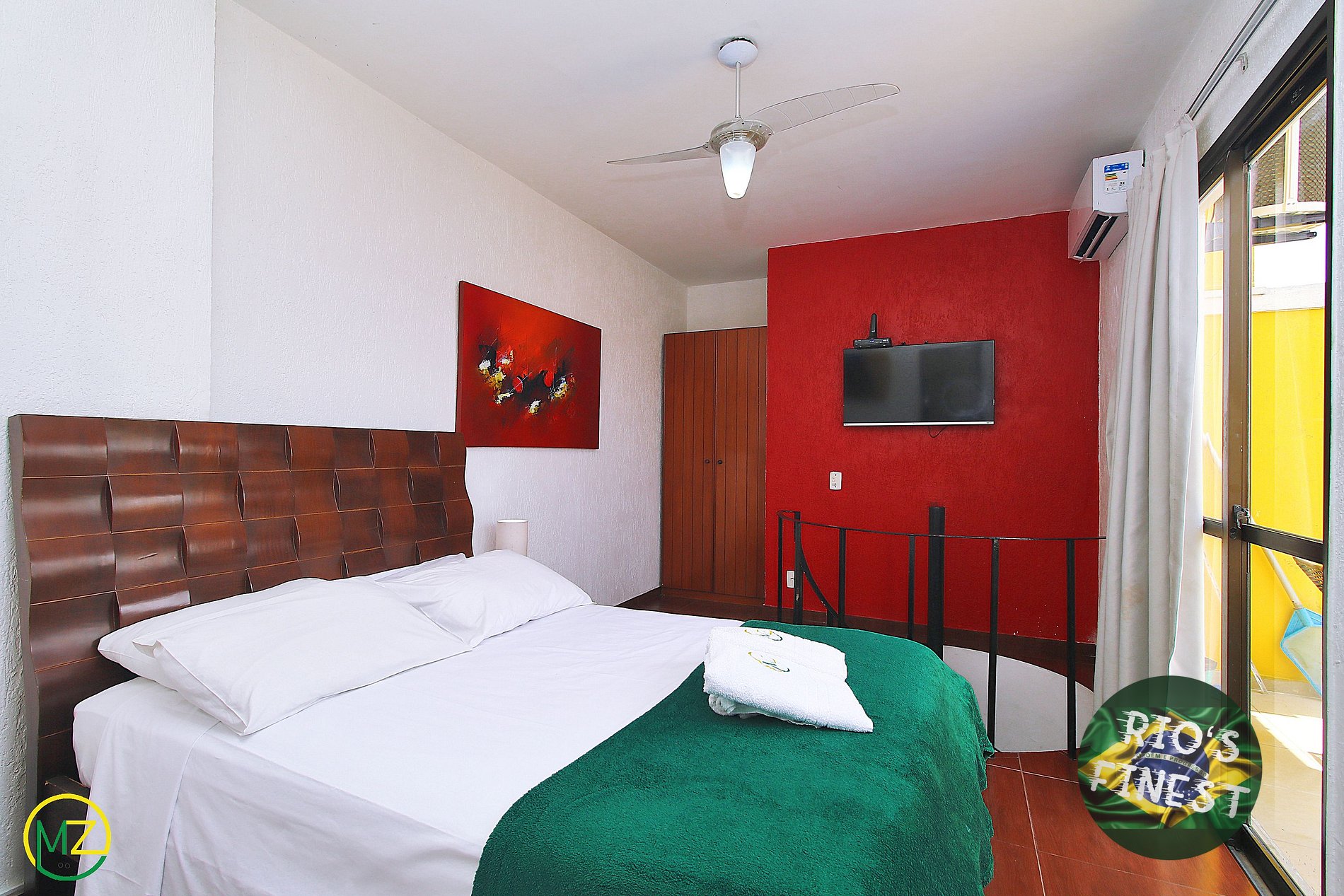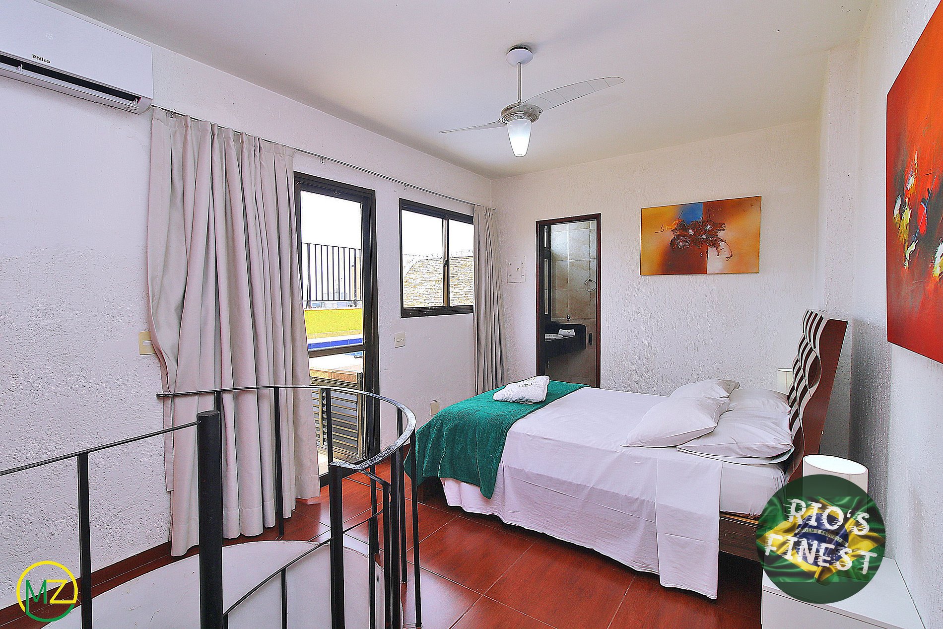 Subiendo la escalera de caracol, se llega al segundo piso que tiene un dormitorio (sin puerta) con cama doble, pequeño armario, SmartTV, ventilador de techo y aire acondicionado split. Justo al frente hay una terraza con mesa y 4 sillas y una piscina para relajarse con una vista panorámica del barrio y el mar de Copacabana.