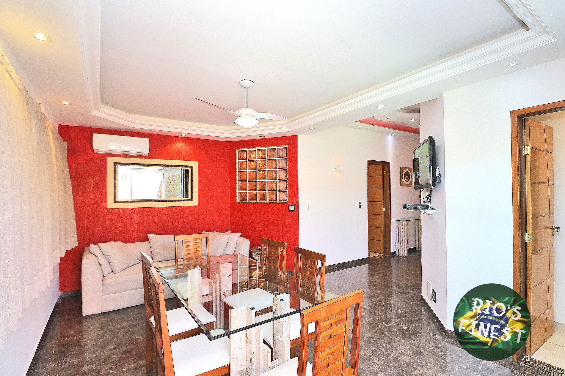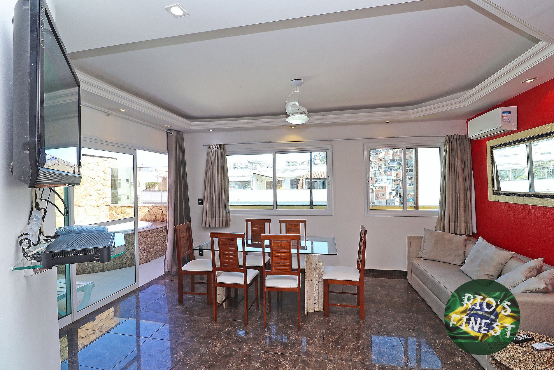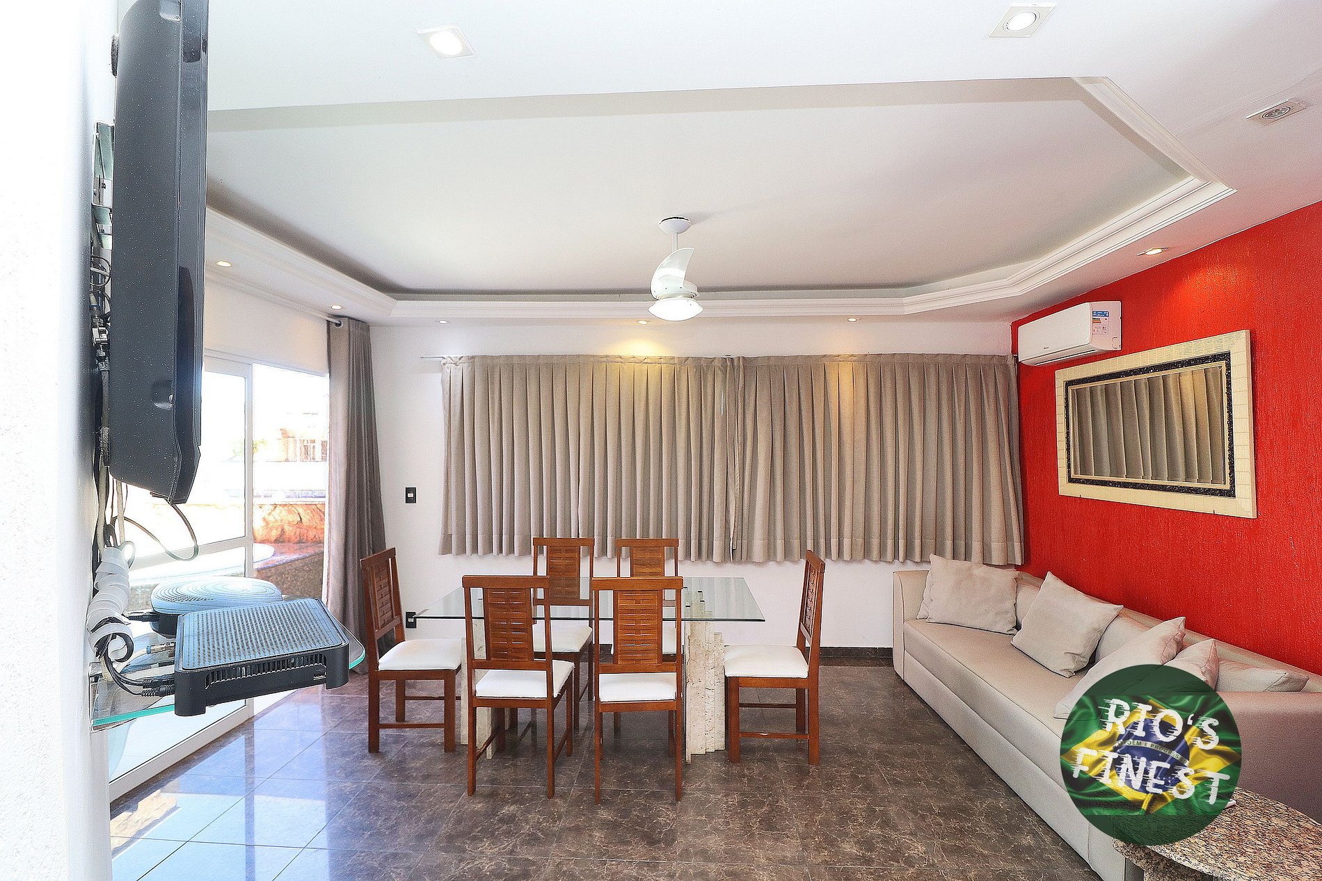 A sala possui um sofá-cama de casal confortável, mesa de jantar com 6 cadeiras, SmartTV, ventilador de teto e ar condicionado split.