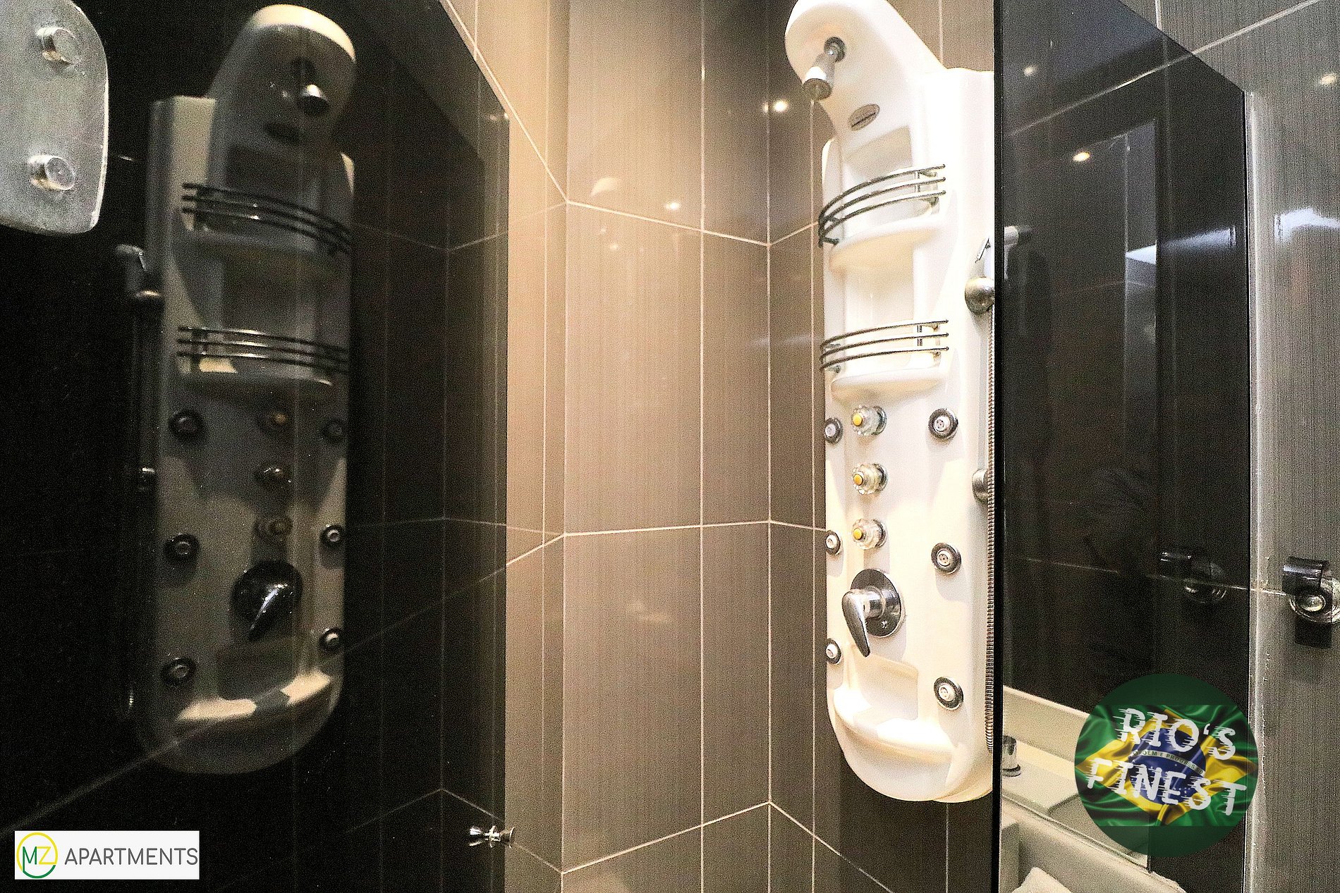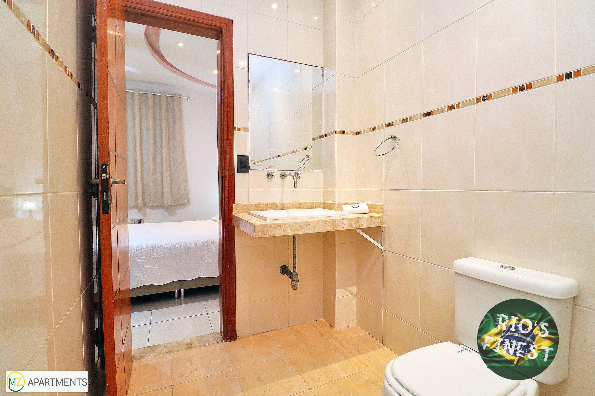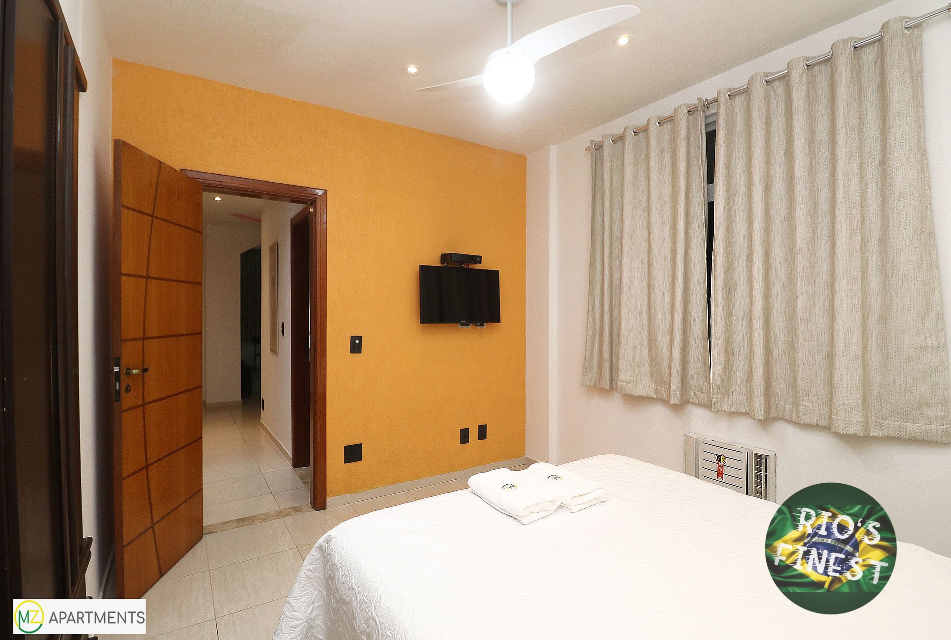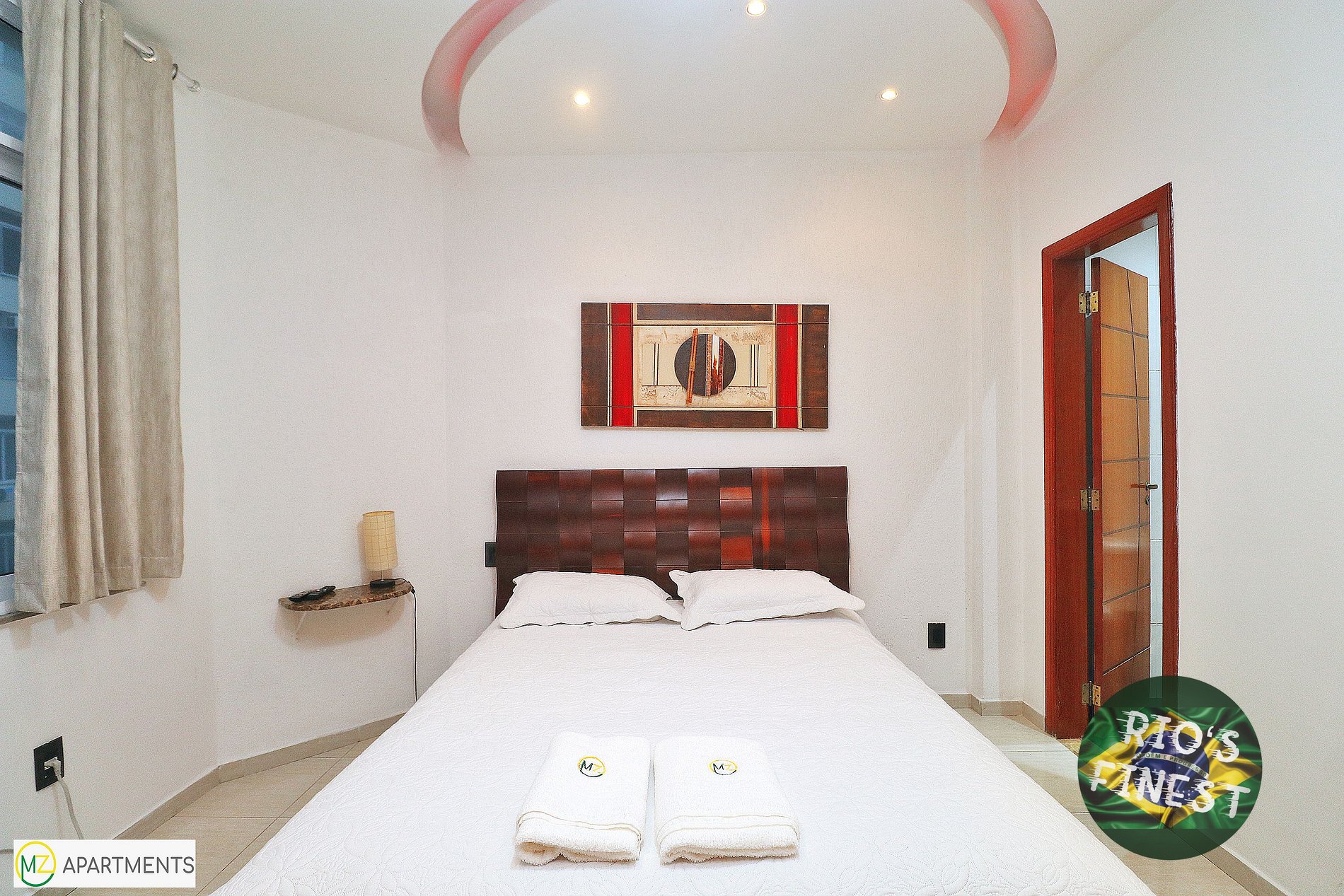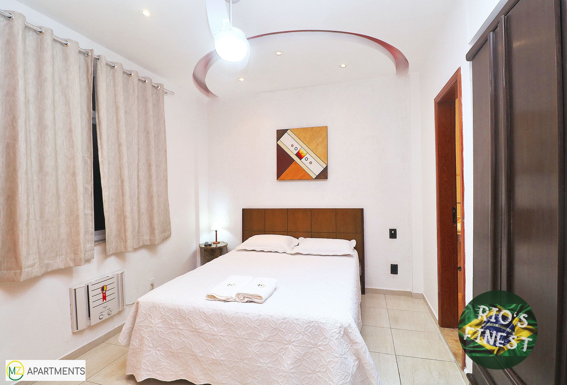 Os três quartos (suítes) com seus próprios banheiros individuais estão equipados com camas de casal, guarda-roupa, ventilador de teto, SmartTV e ar condicionado. Dois quartos estão virados para os fundos do prédio (silencioso) e o terceiro quarto oferece uma vista maravilhosa para o mar e a praia de Copacabana.
