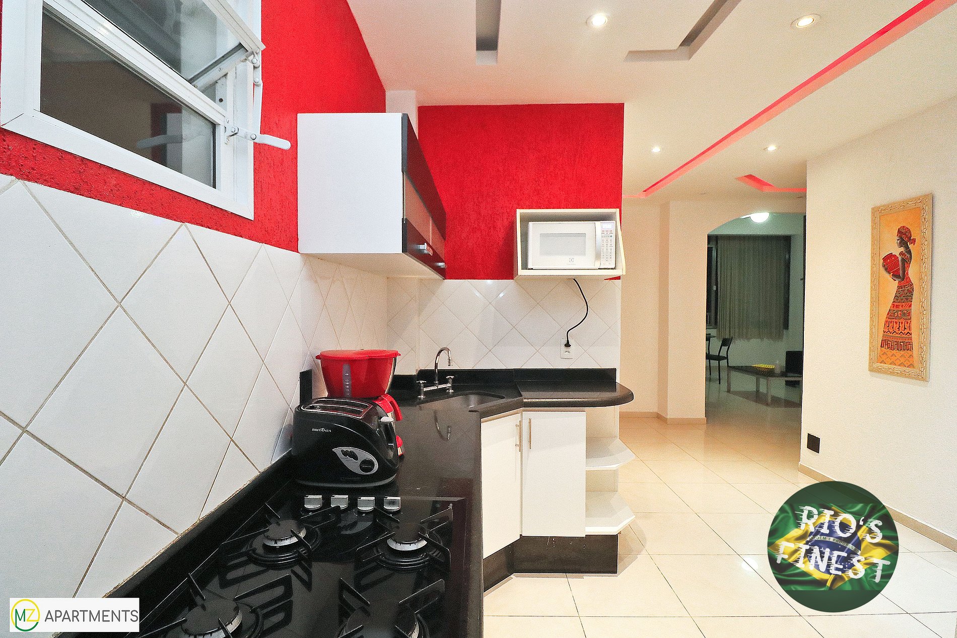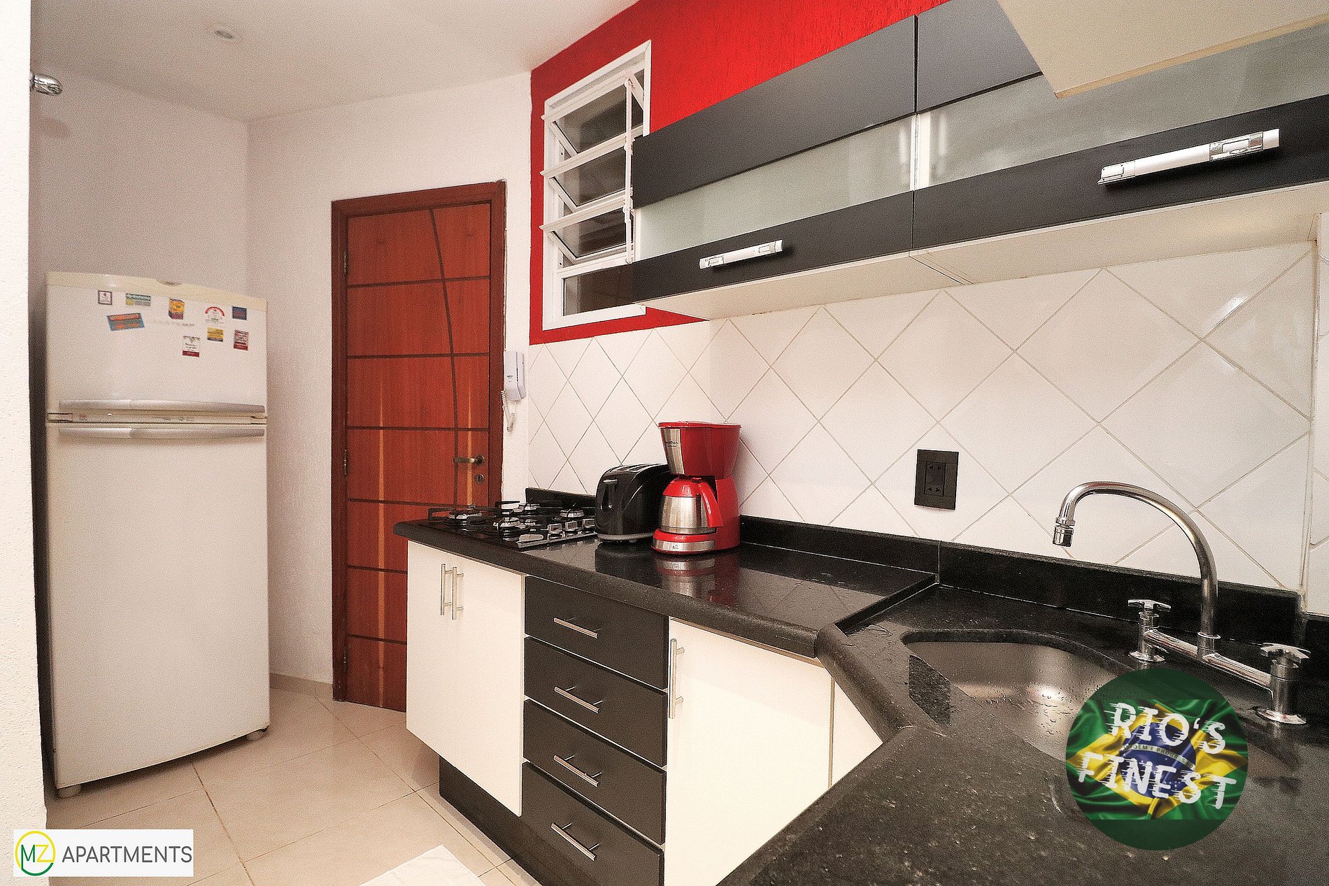 Cozinha com fogão cooktop 4 bocas, geladeira, microondas e utensílios básicos para cozinhar.