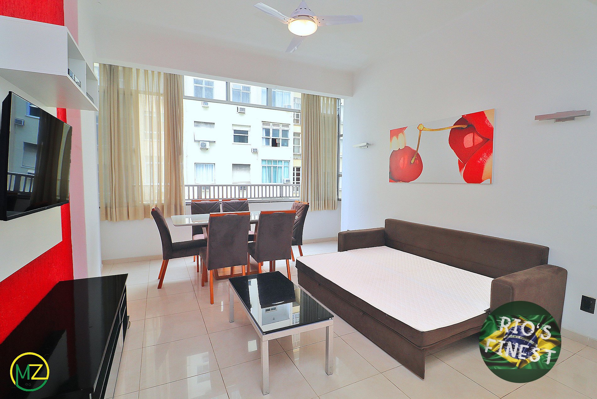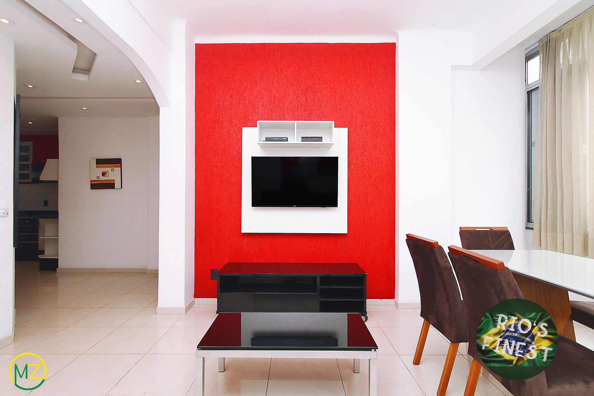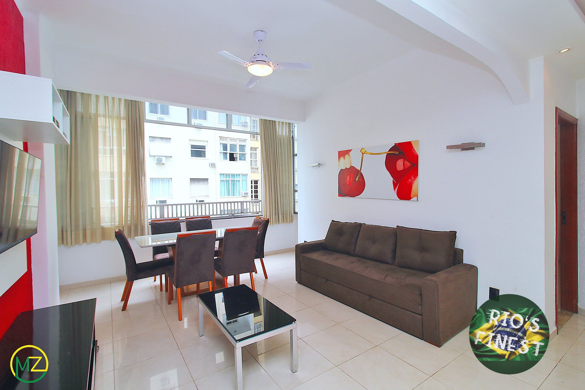 Imóvel tem 90m² e está dividido em uma linda sala de estar, conectada com uma cozinha aberta, três quartos e três banheiros suites. Na sala, você encontra um sofá-cama de casal confortável, uma mesa de jantar com 6 cadeiras, SmartTV e ventilador de teto. Grandes janelas permitem a entrada de luz natural no apartamento durante o dia